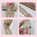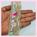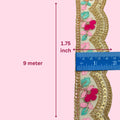 Elevate your style with the Jolly Counter Present's exquisite gold and pink sequinned belt, featuring stunning multi-color embroidery lace and palmet jari detailing. Measuring 2 inches in width and 9 meters in length, this versatile accessory is perfect for enhancing sarees, dresses, lehengas, and even home décor projects. Its shimmering sequins and intricate design add a touch of elegance and glamour, making it an essential addition to your wardrobe or crafting supplies. Transform your outfits and living spaces with this luxurious belt that promises to make a statement.