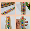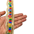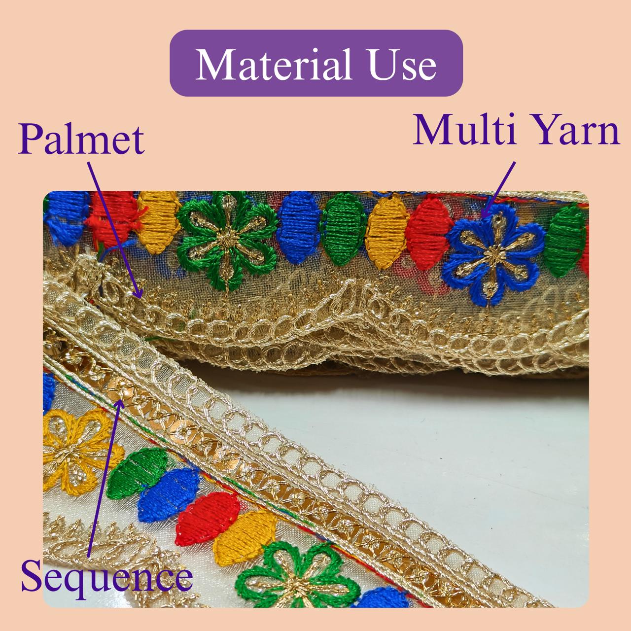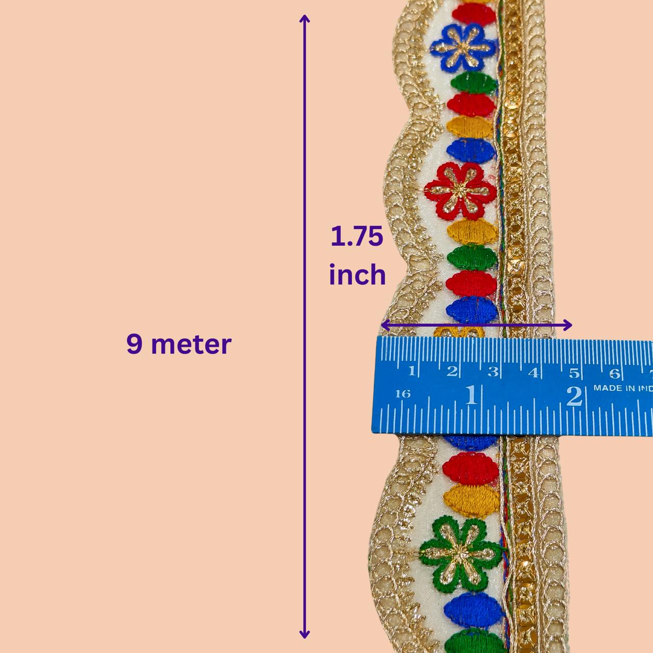 1. Elevate your crafting and decorating projects with the Jolly Counter Present New Embroidery Lace. This exquisite gold-colored embroidered trim features a stunning multi-color palmet jari design, measuring 2 inches in width and 9 meters in length. Perfect for enhancing sarees, dresses, lehengas, or adding a touch of elegance to your home decor, this versatile lace is a must-have for anyone looking to create beautiful, personalized pieces. Transform your creations with this luxurious trim and make a lasting impression.